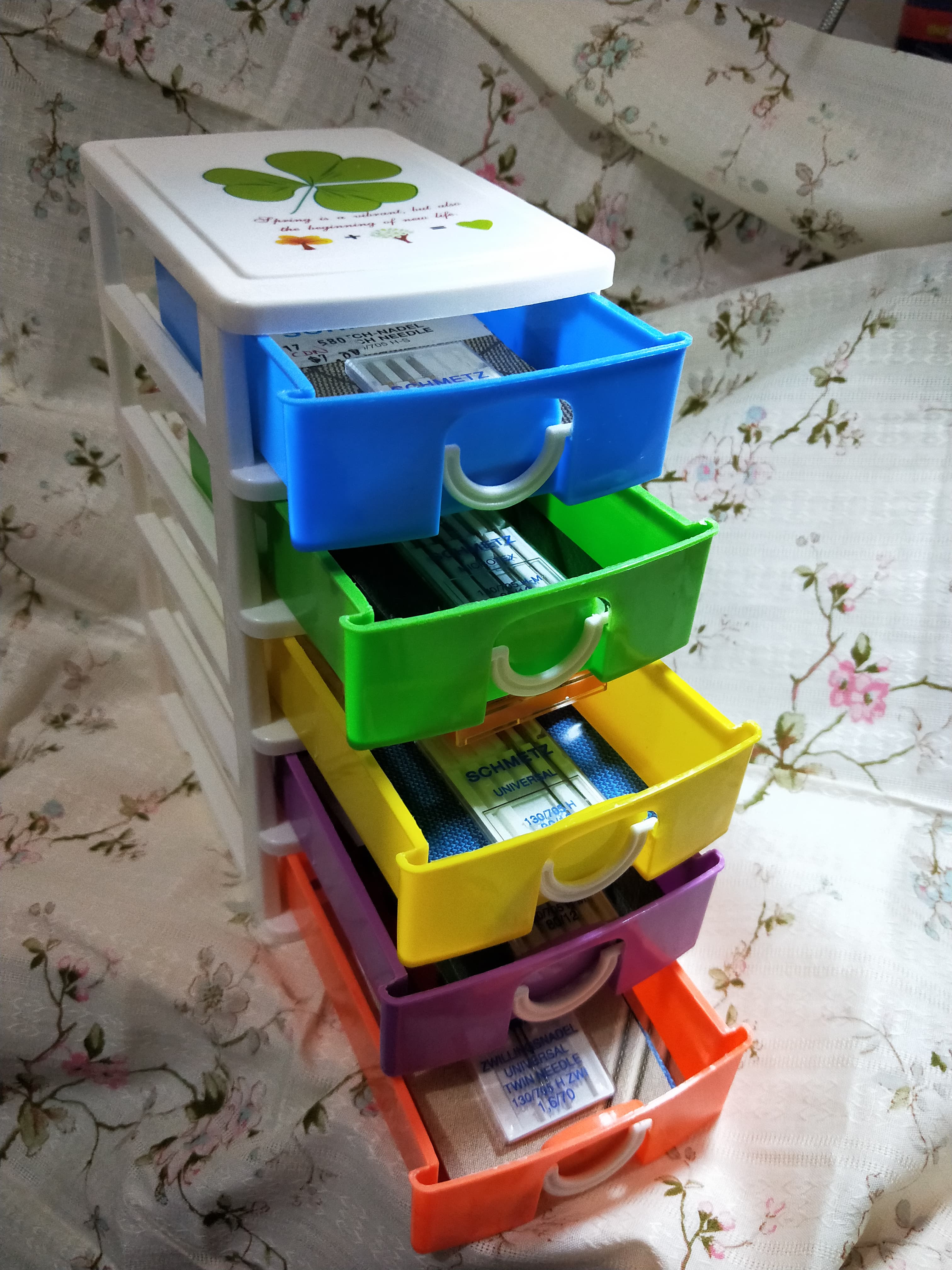 When I started sewing I had no idea that different needles were required for different applications in sewing. I soon found out that a universal needle was terrible for chiffon, or stretch fabric. I ended up buying a whole heap of different needles for different applications and now have my own collection of needles. Mine here in this picture are Schmetz brand just to show you what I have and how I have stored them. I purchased this little storage container from Wish.