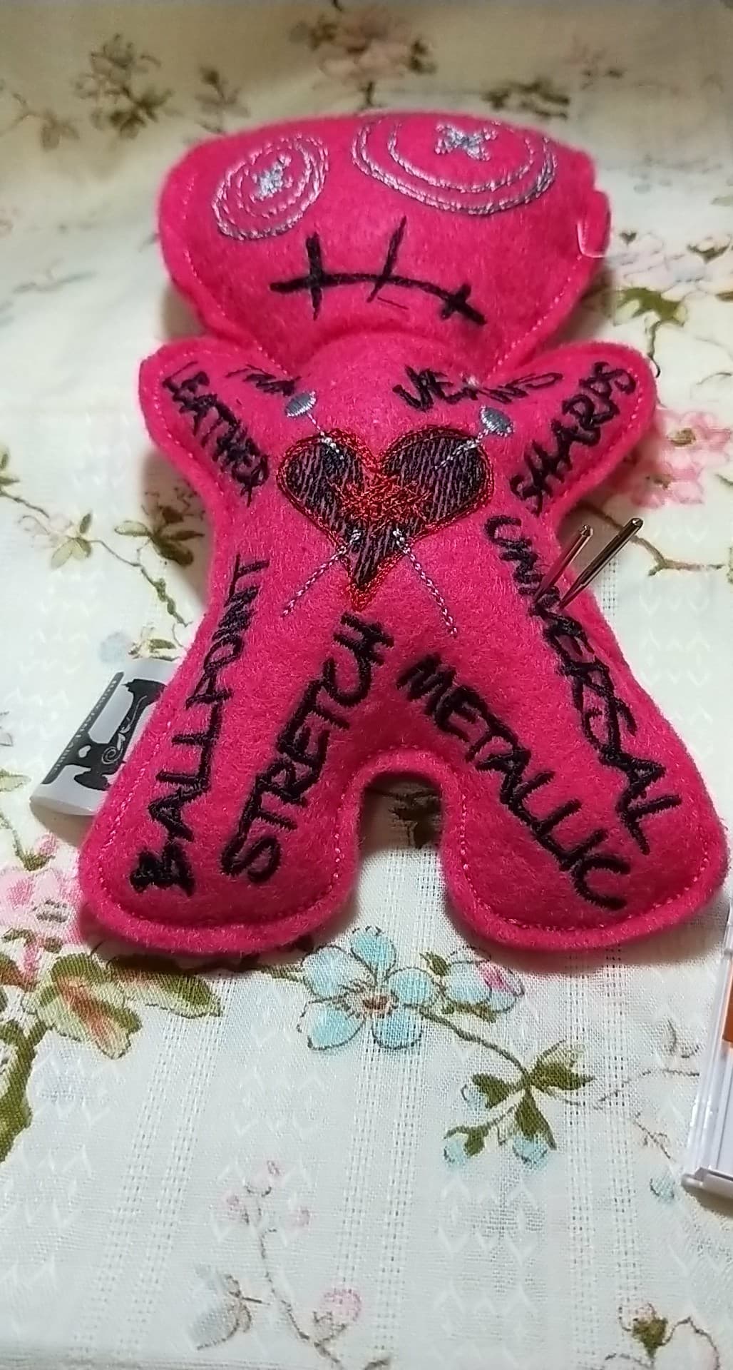 I then found this unique and brilliant tool at Rubyjam and it was a real game changer for me. I only started using it a week or so ago and already I have two needles in it. It’s the Voo-doo pin cushion dolls which are exclusive to Rubyjam Fabric. A great way to store your used needles. Simply put the type of needle in the spot marked with that type. Sometimes you haven’t used a needle for long and therefore it is still good to use at a later date for another project. I have one of these dolls and here is another picture of it in use. It’s truly the most innovative sewing tool I have found.