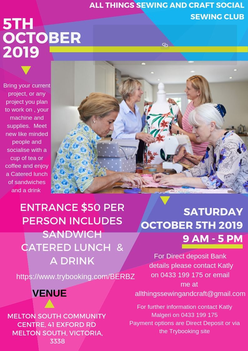 Remember if you don’t wish to purchase your tickets via TryBooking please message me on Facebook or Email me at allthingssewingandcraft@gmail.com with your name, address, phone number, email address and the QTY you wish to purchase and I will send you the bank details to make your deposit. The tickets will be emailed to you the same as if you used TryBooking