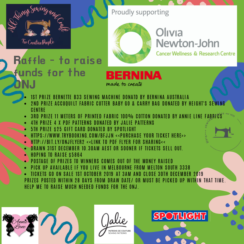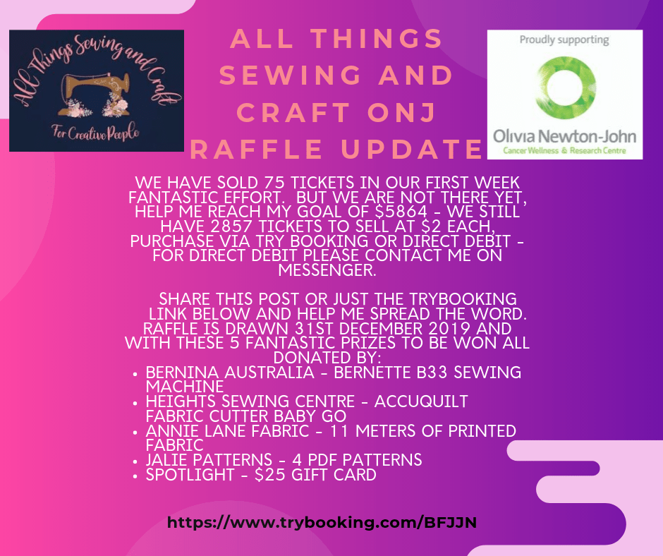 • All Things Sewing and Craft Raffle – raising money for the Olivia Newton-John Cancer Wellness & Research Centre. Tickets are $2 each, and I have a special when you purchase 10 tickets you only pay $18.50. TryBooking fees apply when purchasing via TryBooking however if you perfer to pay Direct Debit please contact me either on 0433 199 175 or message, email me via the website http://www.katlyplus.com or Facebook either the Page or Facebook Group – This raffle will be drawn 31s December 2019 here is a link to the post on Facebook about the raffle and all the fantastic sewing related prizes to be won. https://www.facebook.com/events/885430995184271/ You can purchase your tickets via the link in the details section of the EVENT, and take a look at the Flyer link for a look at the prizes. Hope you can get behind me on this great cause that I am raising money for.