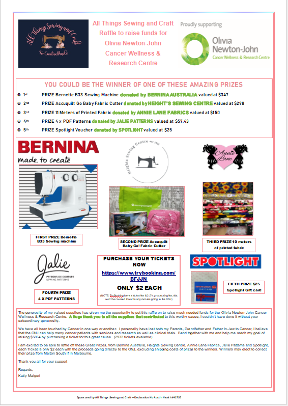 All Things Sewing and Craft Raffle – raising much needed funds for the Olivia Newton-John Cancer Wellness & Research Centre